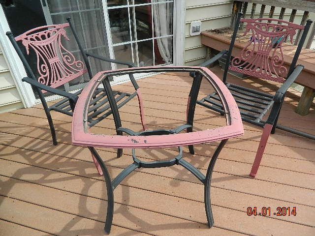One of the projects we got done on a warm day.  We had this set but it needed painting…badly.  So we were yard-saling last weekend and this one house had all those cushions you see for $20.  I was so excited.  Have you shopped for that stuff lately?  Just the bench cushions I found were 29.99, so yea this was a no bargaining situation, we handed the 20.00 over and thanked the man and went on our merry way.