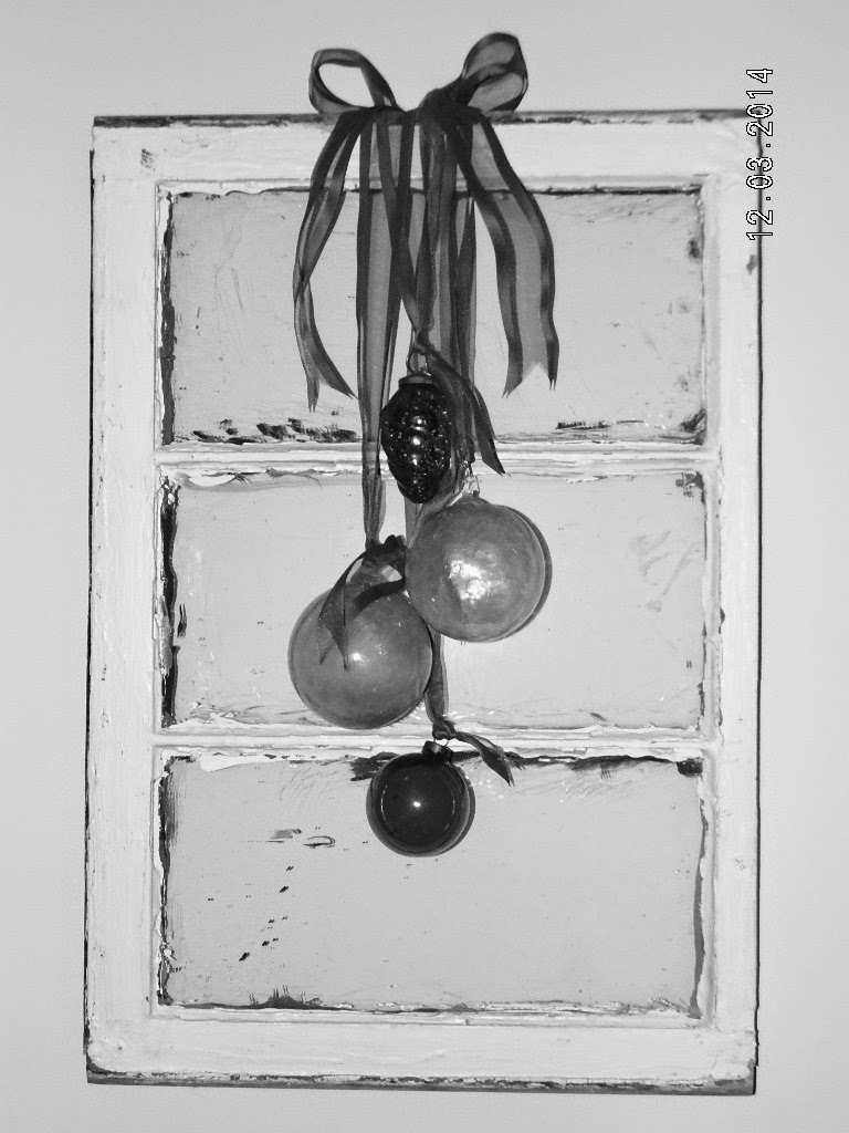I saw something like the window pictured below, made with a 6 pane window, on pinterest. We picked up this cute window at an odd yard sale, more like a resale of parts and pieces sale that had lots of building supplies and some cool antiques. At the time all I knew was that I wanted it, no clue what for, I just wanted it. So happy I had this little gem in the garage (note to my dear husband, thank you for putting up with my overflow of pieces to paint or decorate in the garage). Anyway I also have a great collection of cool ornaments both old and new, that top red one I got from this great little shop in downtown Fredericksburg – Hooked, you can follow them on Facebook here – https://www.facebook.com/becomehooked. Anyway the two blue ones I have had for years, can’t recall where they came from and the lower beautiful red one also escapes my memory of whence it came, but I love it. I was going to scrape, sand and paint and my daughter advised me that would not be a wise choice, so I washed and vaccumed the crevices and left it as it, boy was she right, so glad I let it be.
