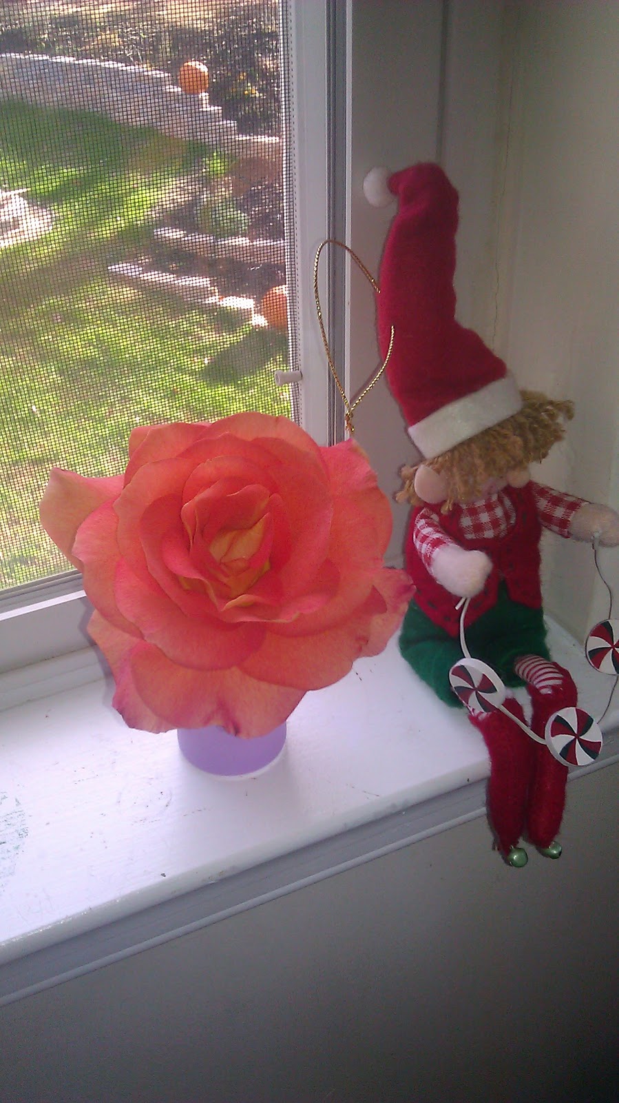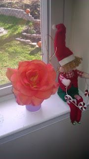 I was sewing away this weekend, finally got the sofa cushions finished, and my husband walks up to me and says he has a present for me. My husband can be a trickster so I was leery and expected something that would make me laugh or jump. Not the case, he handed me this beautiful flower from our very own rose bush that bloomed at the end up November, nature is so cool and so is my husband for thinking to bring it to me.