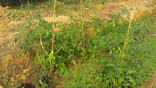 Tomato plants somewhat in distress with leaves turning yellow but some flours and a few small green tomatoes.