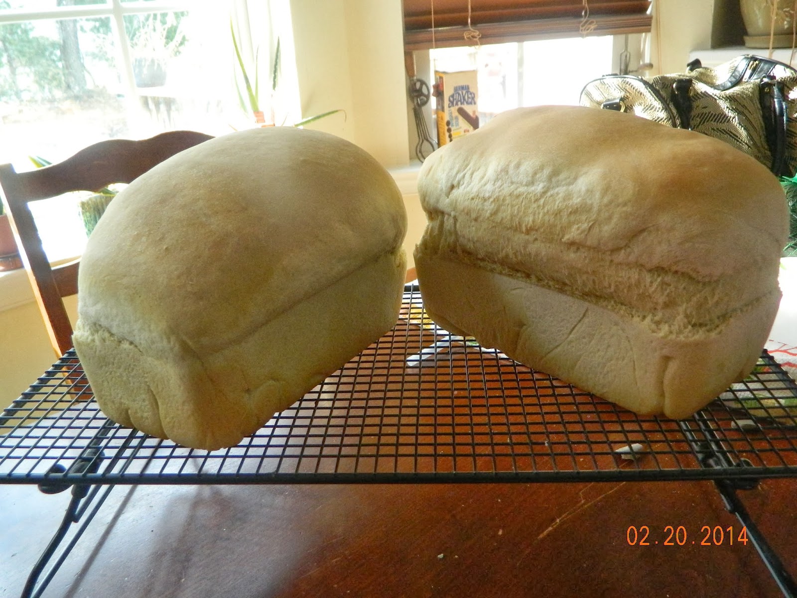Oh I lied, I did make one change and per my usual it only happened because I made a mistake. See I turned the oven on and then when the bread was done rising, I put it in the oven and hit what I thought was the timer on button and set it for 40 minutes. What I didn’t know until about 30 minutes later was that I actually turned the oven off. My daughter discovered it and called me to come and look at what the bread did. It was risen good and high, so high the slices wouldn’t fit into the toaster.
